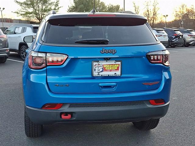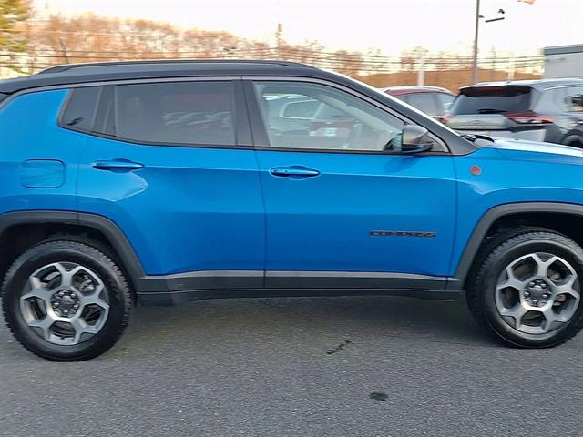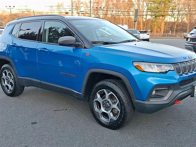 Certified. Laser Blue Pearlcoat 2022 Jeep Compass Trailhawk 4WD 9-Speed 948TE Automatic 2.4L I4 4WD. Quick Order Package 2GE, Trailhawk Convenience Group (115V Auxiliary Power Outlet, 2nd Row USB Type A/C Charge Only, Heated Front Seats, Leather Wrapped Steering Wheel, Power 2-Way Driver Lumbar Adjust, Power Adjust 8-Way Driver Seat, Remote Start System, Reversible Carpet/Vinyl Cargo Mat, Vehicle Information Center, and Windshield Wiper De-Icer), FCA US LLC Certified Pre-Owned Certified, 4WD, 10.1" Touchscreen Display, 4-Wheel Disc Brakes, 4.334 Axle Ratio, 6 Speakers, ABS brakes, Air Conditioning, Alloy wheels, AM/FM radio: SiriusXM, Anti-whiplash front head restraints, Auto High-beam Headlights, Auto-dimming Rear-View mirror, Automatic temperature control, Brake assist, Bumpers: body-color, Compass, Delay-off headlights, Disassociated Touchscreen Display, Driver door bin, Driver vanity mirror, Dual front impact airbags, Dual front side impact airbags, Electronic Stability Control, Emergency communication system: SiriusXM Guardian, Four wheel independent suspension, Front anti-roll bar, Front Bucket Seats, Front Center Armrest w/Storage, Front dual zone A/C, Front fog lights, Front License Plate Bracket, Front reading lights, Fully automatic headlights, Global Telematics Box Module (TBM), Heated door mirrors, Illuminated entry, Knee airbag, Leather Shift Knob, Low tire pressure warning, Occupant sensing airbag, Outside temperature display, Overhead airbag, Overhead console, Panic alarm, ParkView Rear Back-Up Camera, Passenger door bin, Passenger vanity mirror, Power door mirrors, Power steering, Power windows, Premium Cloth/Leather Trim Bucket Seats, Radio: Uconnect 5 w/10.1" Display, Rain sensing wipers, Rear anti-roll bar, Rear seat center armrest, Rear window defroster, Rear window wiper, Remote keyless entry, Roof rack: rails only, Security system, Speed control, Split folding rear seat, Spoiler, Steering wheel mounted audio controls, Tachometer, Telescoping steering wheel, Tilt steering wheel, Traction control, Trip computer, Turn signal indicator mirrors, Variably intermittent wipers, and Wheels: 17" x 6.5" Painted Diamond Cut Aluminum. The team of sales, finance, and service professionals at our dealership go above and beyond to deliver exceptional customer service, every time. We're proud of the service we provide our customers, and we have the people to back it up. We've repeatedly earned the Customer First Award for Excellence, which is bestowed to select dealerships that have achieved the highest level of customer experience recognition in the program's five core areas: Customer Treatment, Employee Engagement, Facilities, Processes, and Training Certification. Be sure to check out our Google reviews for further proof of our dedication to serving customers like you. 22/30 City/Highway MPG FCA US LLC Certified Pre-Owned Details: * Vehicles Up to 75,000 Miles and/or 5 Model Years. 24-Hour Towing & Roadside Assistance, Car Rental Allowance, CARFAX̨̉ Vehicle History ReportTM and an Introductory 3-month Subscription to SiriusXM̨̉ Satellite Radio & Certified Warranty Upgrades * Powertrain Limited Warranty: 84 Month/100,000 Mile (whichever comes first) from original in-service date * 125 Point Inspection * Roadside Assistance * Warranty Deductible: $100 * Transferable Warranty * Limited Warranty: 3 Month/3,000 Mile (whichever comes first) after new car warranty expires or from certified purchase date * Vehicle History