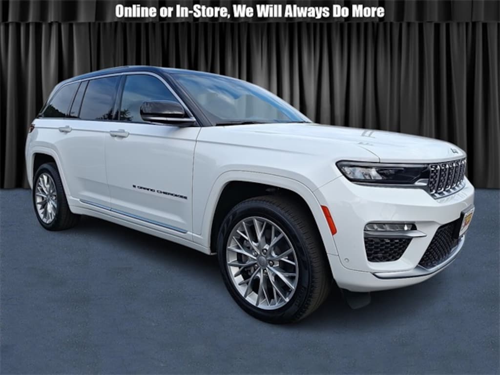 Bright White Clearcoat 2023 Jeep Grand Cherokee Summit Reserve 4xe 4WD 8-Speed Automatic 2.0L I4 DOHC 2.0L I4 DOHC, 4WD, ABS brakes, Alloy wheels, Compass, Electronic Stability Control, Front dual zone A/C, Heated door mirrors, Heated front seats, Heated rear seats, Illuminated entry, Low tire pressure warning, Navigation System, Power Liftgate, Power moonroof, Rear dual zone A/C, Remote keyless entry, Traction control.